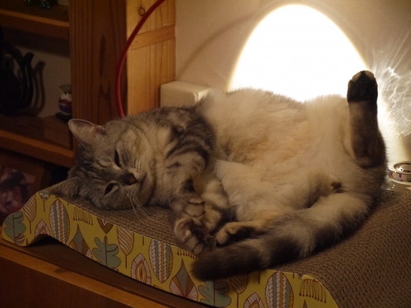 写真が斜めになっておりますが、 ウリ猫が抱え込んでいるこの白い物体は何かと申しますと――、 オバの、たくましいふとももでございます。 左足は伸ばし、右だけを曲げてカエル座りをしていたところに、 のしっと乗ってきました。 例によって――、 カメラを向けると、とたんにむっすり顔になりましたが、 この状態で、赤ペン先生を励ましてくれていたわけです。 つくづく思うんですが、 ウリ猫は有能な(?)秘書であると同時に、 ...