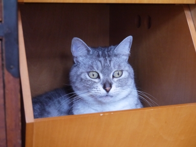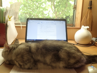 まだ梅雨入り前ですが、 梅雨入りそうそうですが、 恒例の 夏の嫌がらせ (⇒☆夏の嫌がらせ2016) 始めました。 位置について〜 配備完了! 灰色しましまピーナッツ型、ザ・嫌がらせ。 お尻でパソコンの排気口をふさぎ、 頭で辞書をブロック。 完璧です。 がんばってくれ、パソ子。 あちこちの軒先や戸袋から ひなたちの声が聞こえる季節ですね。 (巣立ちびなを見かけても、拾わないでくださいね。) ...