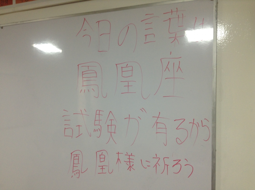 JUGEMテーマ:日本語教育 今日の言葉 以前、「陰陽座」って 書いてくれた時は、 真剣に、 そんな星座あったっけ? と聞いて、 「バンドの名前です」 と言われたので、 今回もそうだと思い、 何のバンド? って聞いたら、 「これは星座ですー」 だって。 ぬぁーーー!!! ややこしいわーーー!!!o(`ω´ )o 今日は試験です 神...