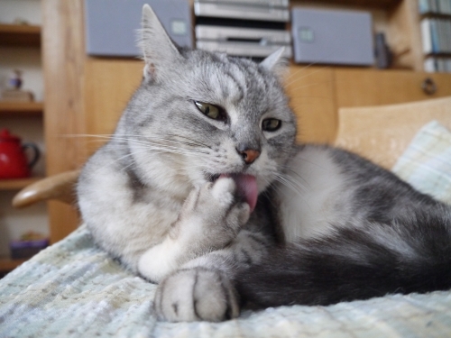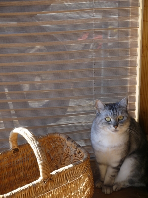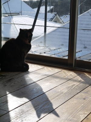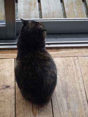 ★文型【...んだけど。】 天気予報欄にはお日さまマークが並んでいるのに、なぜか日ざしのかけらもなかった、日曜日の朝。毎朝の日向ぼっこ場に陣取る黒っぽい姐さんの、雄弁な背中。ああ、ご不満でいらっしゃる。このとき、室温は16度。前夜からの薪ストーブの余熱があるので、この温度でも、しのげないことはありません。ここで下手にストーブを焚いて、そのあと予報どおりお日さまが出てきたりしたら、暑くなりすぎます。うむ、ここは、ガマンだ。ガマンしてくださいまし。と、背中が振り向いた。寒いんだけど。あ、はい。...