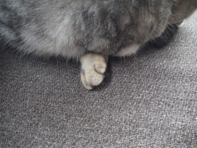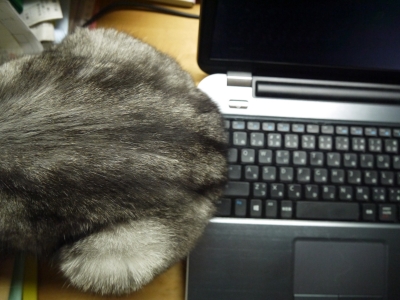 ★文型【〜(する)に〜(でき)ない】心ならずもXPとお別れし、あたらしくおつきあいを始めたのは、ノートパソコン。省スペースでじつによいと思うのだけれども、ときおり......閉めるに閉められない。少し肌寒かった日、ウリが仕事部屋に遊びに来ました。先代PCのタワーほどの暖房効果はないようですが、とりあえずくっついて、スヤスヤと瞑想に入る。おばが一区切りつけて席を立ちたいと思えども、灰色のお尻が邪魔で、パソコンのふたが閉められませぬ。横から見た図。あー、じゃまくさい。猫って、どうしてこうじゃまくさいのか...