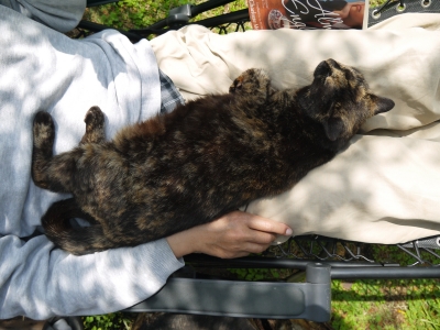 ★文型【格助詞の「が」と「で」】 5月の庭は、庭猫の天国。ちっさい庭にも花が咲き、木漏れ日が心地よい。たまさか風の冷たい日があっても、おじちゃん式「床暖」に乗っていれば、問題なし。家猫になるべき理由なんか、どこにも見当たらない。だから......庭でいいわ。うんにゃ、庭がいいわ!ウリはウチ! ※格助詞「が」と「で」の解説と、おまけ写真につづく。(↓)