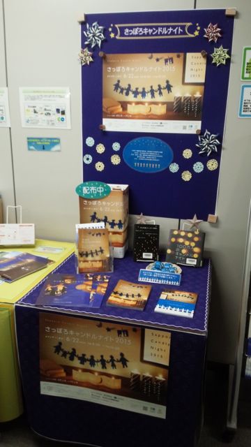 JUGEMテーマ:札幌市 毎年、素敵にディスプレイしてくださっている北海道環境サポートセンターさん。 今年も、すばらしい!!↓こんな素敵なキャンドルの炎のような飾りも、てづくり! パンフレットやポスターを並べてある台に敷かれた用紙も、凝ってます。 ☆も、実は、sapporo candle nightの文字で出来ているんですよ。 感動ものです☆ありがとうございます♪ 北海道環境サポートセンター