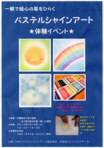 今日はパステルシャインアート北海道 PRイベント♪ 原画展示も行います。 私も新作を持参します〜☆ *:.。..。.:*・゜゚・*:.。. .。.:*・゜゚・**・゜゚・*:.。..。.:*・ 地下歩でパステルシャインを体験しよう♪ 日時:2015年5月16日(土)10:00〜18:00 場所:北海道札幌市北3条交差点広場(札幌地下歩行空間) 内容:パステルシャインアート体験、作品展示、ハガキ等印刷物販売 *:.。..。.:*・゜゚・*:.。. .。.:*・゜゚・**・゜゚・*:.。..。.:*・ パステルシャインアートとは、自分自身で描くことがヒーリング効果をもち、 心に光をあて、ゆっくり...