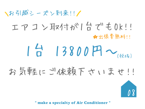 エアコン取り外しが一台でも喜んで工事にお伺い致します!! 現在、一年で一番エアコンがお買い得な時期です!! ネットで買ったエアコンの取付でも大歓迎です!! 富山県のエアコン工事なら専門業者のエイト設備技研へ 県内の年間工事件数500件以上!! ■富山県のエアコン取付・取外はエイト設備技研におまかせください ■富山県内年間500件以上の工事実績!! 富山県の皆様に選ばれています ■取外パック5800円(税別)・取付パ...