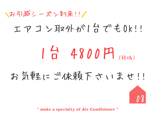 GW中の営業につきまして 5月1日(火)〜5月6日(日)の間は、休業させていただきます。 エアコン工事受付のお電話は留守番電話になっています。 5月に工事予定のお客様は、メールでのお見積りのご依頼や、工事のご依頼は受け付けていますのでそちらから早めにお申し込みくださいませ。 なお、5月・6月と多くに工事がすでに入っていますので対応できない日もありますので予めご了承くださいませ。 宜しくお願い致します。 →→メールフォームで3分★簡単にご依頼できます...