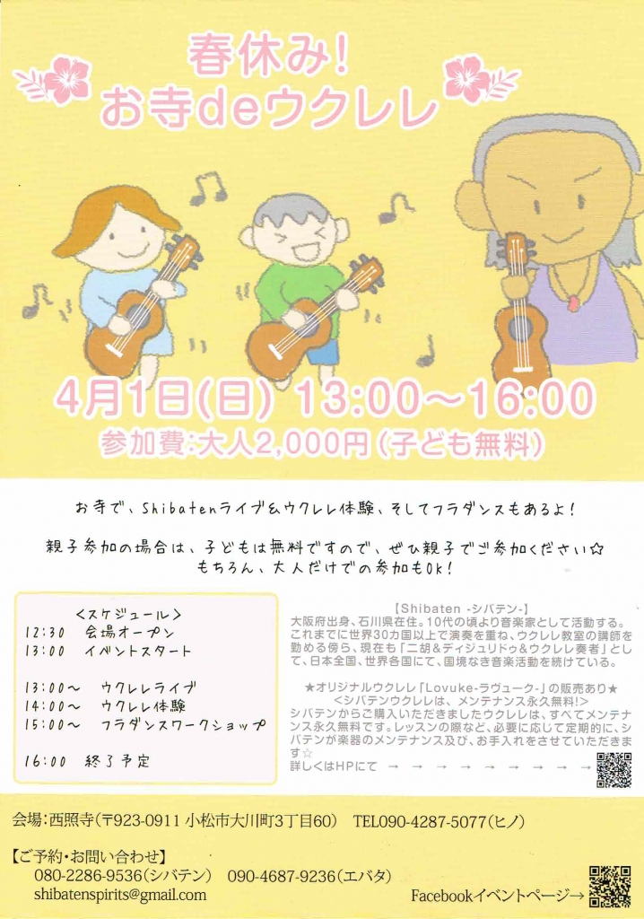 ♪『春休み!お寺deウクレレ』♪(子ども無料!) お寺で、Shibatenライブ&ウクレレ体験、そしてフラダンスもあるよ! 親子参加の場合は、子どもさん無料ですので、 ぜひ親子でご参加ください☆ もちろん、大人だけでの参加もOK! <スケジュール> 会場オープン 12:30 イベントスタート 13:00 ウクレレライブ 13:00~ ウクレレ体験 14:00~ フラダンスワークショップ 15:00~ 16時終了予定 --------------- ♪「ウクレレライブ」♪ ウクレレで弾けるいろいろな演奏をお楽しみください☆ ♪「ウクレレ体験...