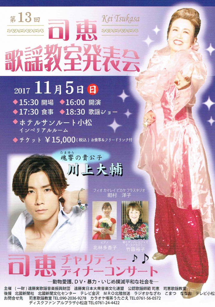 司恵歌謡教室 発表会 11月5日(日) 開場 15時30分 開演 16時 食事 17時30分 歌謡ショー 18時30分 会場 ホテルサンルート小松 インペリアルルーム チケット 15,000円 問合せ 司恵歌謡教室 090‐2036‐9278 JUGEMテーマ:石川県