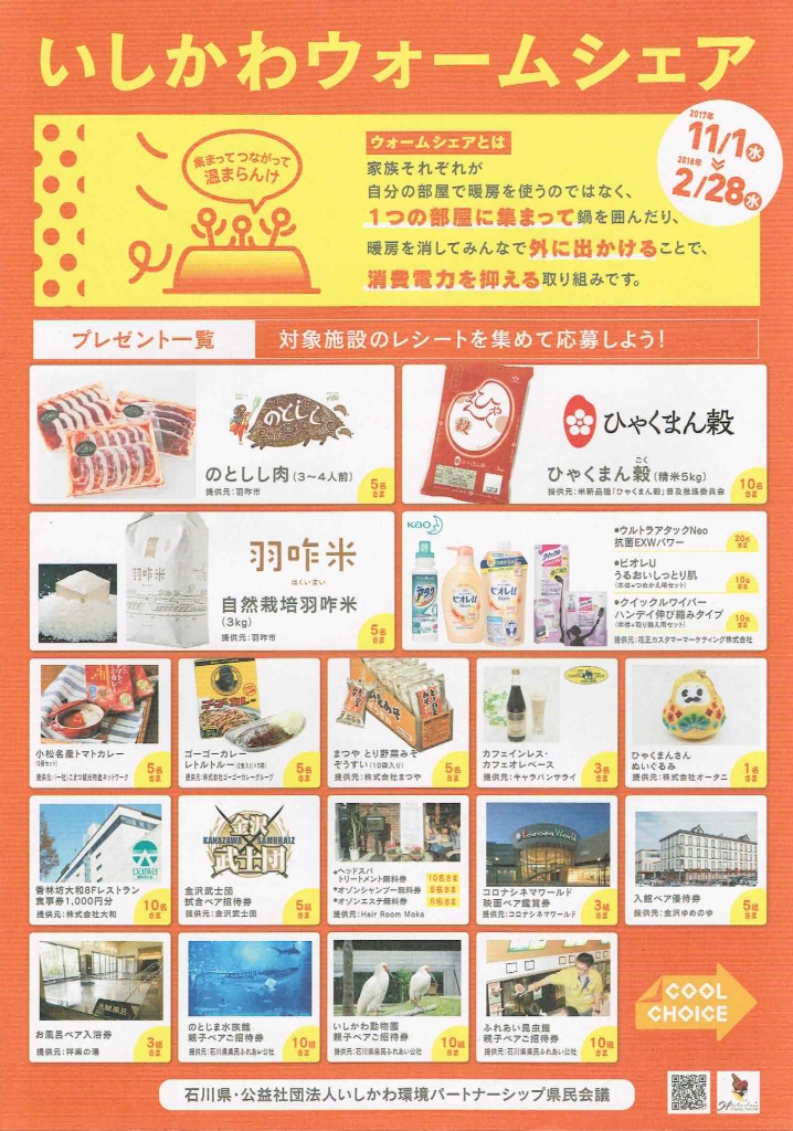 JUGEMテーマ:石川県 ウォームシェアとは? 北陸では、冬場の家庭の消費電力量が、1年の中でも最も多くなる時期であり、 特に夕方はエアコン(暖房)と照明が4割を占めています。 家族それぞれが 自分の部屋で暖房を使うのではなく、 1つの部屋に集まって鍋を囲んだり、 暖房を消してみんなで外に出かけることで、 消費電力を抑え、地球温暖化防止につなげる取り組みです。 こまつまちづくり交流センターも 石川ウォームシェアの取り組みに協力しています。 ...
