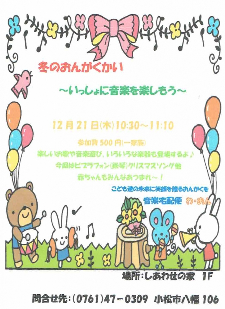 JUGEMテーマ:石川県 冬のおんがくかい 〜いっしょに音楽を楽しもう〜 12月21日(木) 10:30〜11:10 参加費 500円(一家族) 会場 しあわせの家 (小松市八幡106) 演奏 音楽宅配便 わ・おん