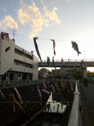 JUGEMテーマ:川崎あれこれ 引っ越してきてから二度目の、鯉の雄姿。 が、フックがひとつ空いているので、下の川を覗くと…。 一匹の鯉が、本当の川の中に…。 あぁ…。 実行委員会のどなたか、気づいて救出してくれたら…。