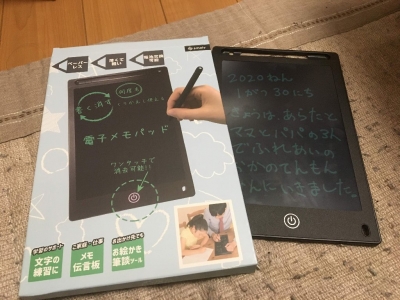 JUGEMテーマ:栃木県 以前からずっと気になっていた(ブギーボードという商品名のものをよく見ていた。)のだが、ケーズデンキのあんしんパスポート会員価格で1024円だったので、倅のおもちゃにと思い購入。ひょっとしたら仕事につかえるかなという淡い期待もあり。 製品の特徴を見てみる。 ・書いたものがすぐ消せる。 →こどものおもちゃでバーをスライドさせて書いたものが消えるボードと同等。 ・解像度も子供のおもちゃと同等か。 ・軽い(139g)、画面サイズは8.5インチ。 ...