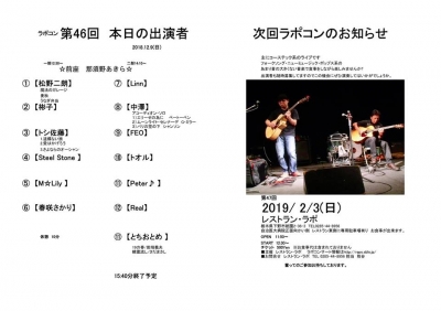 JUGEMテーマ:栃木県 那須野あきらさんのお誘いを受けて、初参加です。 自治医大の敷地内にあるカフェレストラン。 初参加なので、空気読めないなと思いましたが、オープニングアクトの那須野あきらさんの直後になるトップバッターなので、全力で行くしかないですね。(特にやることは変わらないですがf^^;) 皆様のご来場、お待ちしています。 https://www.facebook.com/jin.ooyama/posts/1805085082952807 https://www.facebook.com/events/498621817321243/ 12月9日(日) ●第46回ラポ...