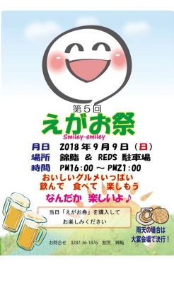 JUGEMテーマ:栃木県 9月、10月のイベント情報 松野二朗が出演ではないイベントもありますが、お時間ある方も無い方も是非お越しください。 松野二朗出演予定のイベントには、●を付けてみましたf^^; 9月9日(日) 16:00-21:00錦鮨、REDS駐車場 ●第5回 えがお祭 パンチの効いた屋台祭り♪(o^^o) 君島大輔/松野二朗/田村鉄火のステージ サクラさんのバルーンパフォーマンスも♪ 入場無料 飲食は、当日「えがお券」を購入してお楽しみください。 9月16日(日) 那須野...