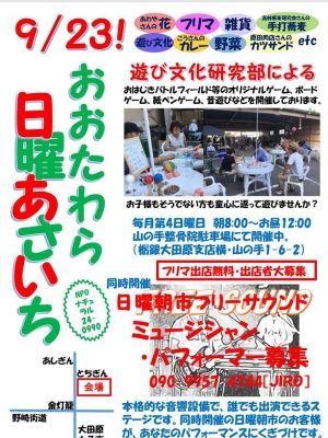 JUGEMテーマ:栃木県 9月23日(日) 8:00-12:00 山の手ビル駐車場(栃木銀行大田原支店横) 入場無料 フリマ、軽食あります。 遊び文化研究部による新企画「朝市で遊ぼう!」もスタート。 犬、猫の里親募集も。 ステージ出演:みっちー、野瀬有美子、Shinichi、CoCoBlue、原田K介、Mike West、natsuko、松野二朗 他 ※ステージ出演者も随時募集中です。 http://ameblo.jp/honoo-suzu/