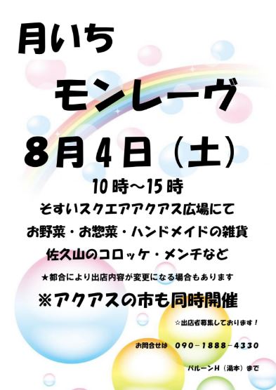 JUGEMテーマ:栃木県 8月3日(金)、4日(土)の午後は大田原で与一まつりなのですが、 8月4日(土)は、西那須野のそすいスクエアアクアスで月いちモンレーヴも開催されます。 与一まつり出演予定の松野二朗や渡辺里奈 他も、午前中にライヴする予定なので、お時間ある方はこちらも是非♪ ●月いちモンレーヴ(毎月第1土曜日開催) 10:00-15:00 そすいスクエアアクアス (〒329-2754 栃木県那須塩原市西大和1-8) 主催者:マダムアッシュさん https://ameblo.jp/hanna-na-na/ 会場...