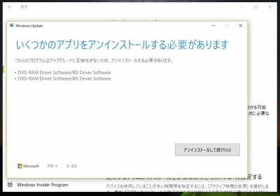 JUGEMテーマ:栃木県 April 2018 Update バージョン1709→バージョン1803 のアップデート。 当初、Chromeの起動に不具合があるとの情報もあったが、5/8に対応されているとのことで、やってみた。 と、 画面のようなメッセージが出て、アップデートできない。 アンインストールって言っても、どうやるの? と困って検索したところ、 DVD-RAMドライバのエラーでWindows10のアップデートができない https://ameblo.jp/toppi-567/entry-12345800468.html とい...