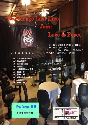 JUGEMテーマ:栃木県 長いことお世話になったエコガレージ森屋、最後のライブになります。 お時間ある方は是非ともご来場くださいませ。 6月16日(土)15:00-21:30 ・エコガレージラストライブ Joint Love & Peace エコガレージ森屋(那須塩原市箕輪648) 入場無料(ワンオーダーをお願いします。) 15時 オープニング(CoCoBlue&相馬剛) 15:05 アッシュ&ダッキャン 15:30 篠原宣義with嶽本章 15:50 松本加奈子 16:20 eastern bloom 16:50 shinichi 17:15 ...