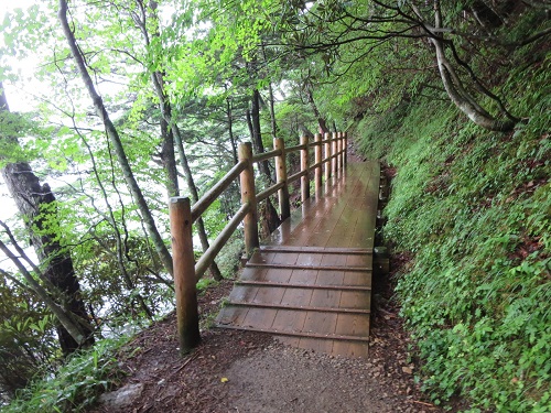 気をとりなおして… さらに湯ノ湖一周コースを進みます。ここは木の橋が架けれています。 木道はいいね〜なんて思ったら…なぜここに橋を架けなければならなかったのかが、このすぐ後にわかり、慄然としました…この辺でがけ崩れがあったからなんですね…(||゚Д゚)怖ァ... それにしても、結構、ワイルドなコースです…決して鼻歌を歌いながらは通れません…特に、雨降ってるときなんて、するっと足を滑らたら… 道幅もせまいし、緊張の連続。 変則的で、常に足元に注意が必要です。 JUGEMテーマ:栃木県