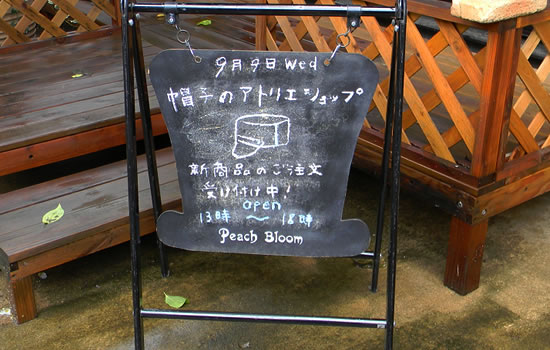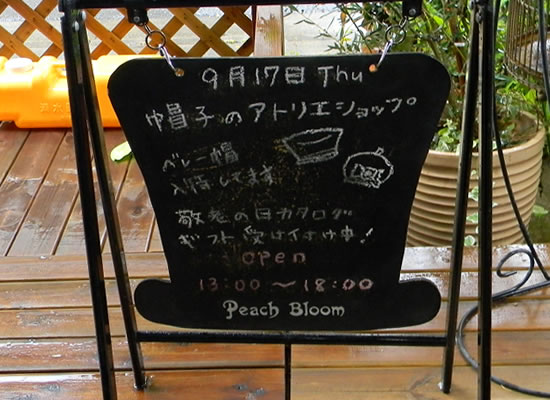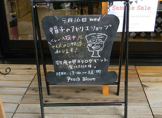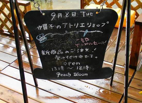 「9/8 火曜日 アトリエショップの営業日です」 只今イベント中(本日最終日!)のPeachBloomですが アトリエショップも(オンラインも)営業です。 看板豪雨でどろっとしてますが・・・。 只今新商品のご注文受付中です! アトリエショップでサンプルの試着もしていただけます! 営業時間は13:00 〜 18:00です。 お待ちしています!