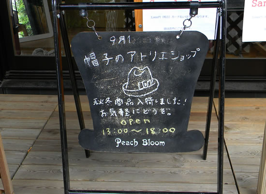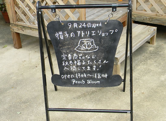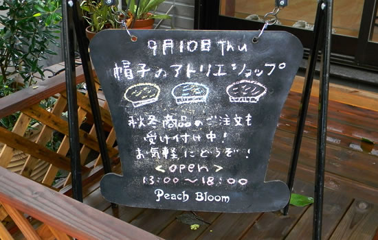 「9/14 月曜日 アトリエショップの営業日です」 本日アトリエショップ営業日です。 営業時間は13:00 〜 18:00。 すっかり秋が来た店内でお待ちしてます。 秋冬の帽子もサンプルセールになっていますよ! サンプルセール商品はこちらからどうぞ↓ http://www.peachbloom.jp/?mode=grp&gid=1061821