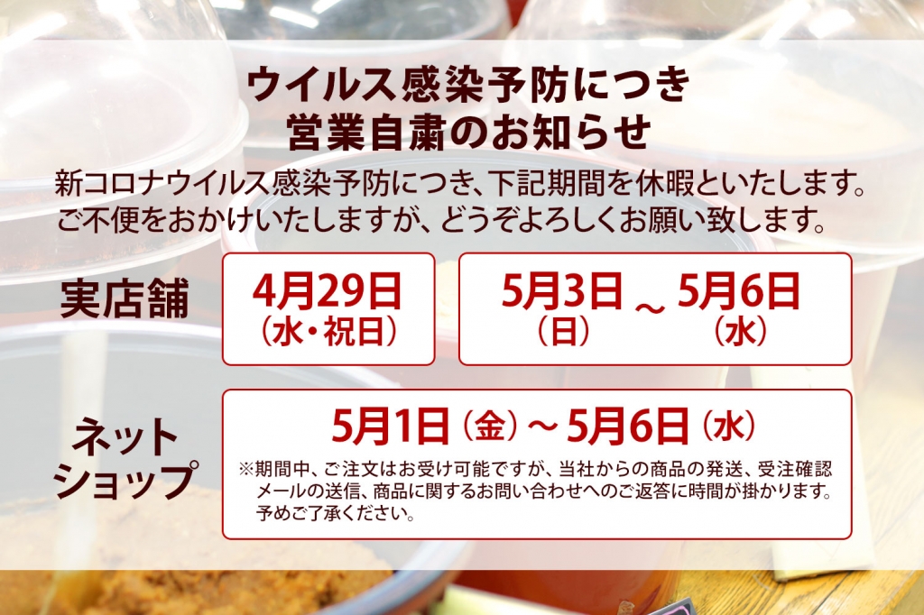【店舗情報】こんにちは!味噌専門店 坂本商店です。 坂本商店は、新型コロナウイルス感染予防のために、誠に勝手ながらゴールデンウィーク中の下記の期間をお休みさせていただきます。 ●各店舗 4/29(水・祝) 5/3(日)〜5/6(水) ●坂本商店 ネットショップ / 楽天 生きてるみそ 5/1(金)〜〜5/6(水) ※期間中、ご注文はお受け可能ですが、当社からの商品の発送、受注確認メールの送信、商品に関するお問い合わせへのご返答に時間が掛かります。予め...