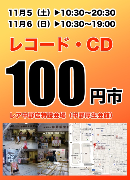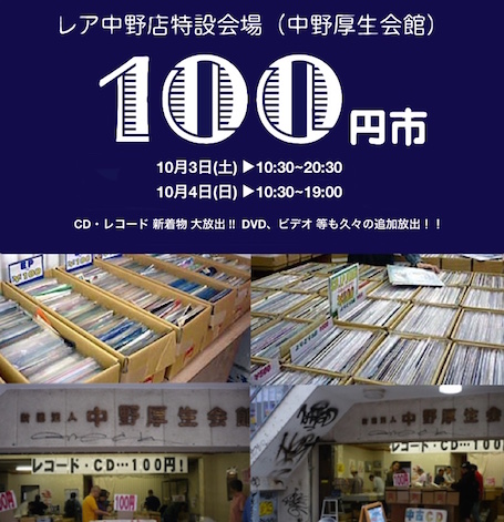 11月5(土)6(日) レア中野店 恒例 ザ・100円市 特設会場(レア中野店 すぐ横 中野厚生会館)にて JUGEMテーマ:中野区 ただいま買い取り強化中!! 聴かなくなったレコード・CD、見なくなったビデオ・ DVDなど お近くの各店舗へお気軽にお気軽にお持ち下さい。(要:身分証)