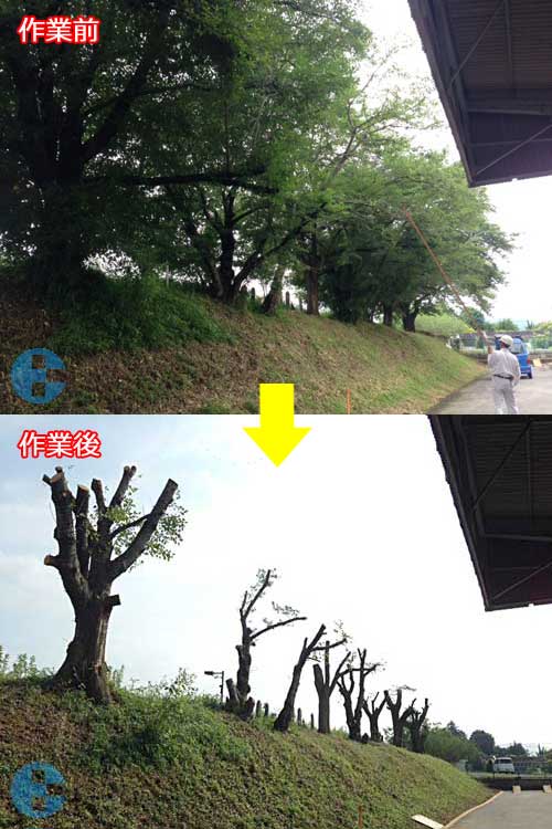 ご依頼有難う御座いました。 7/7(火)・7/10(金)〜7/12(日)の4日間で茨城県笠間市の工場敷地内にある桜の木を8本全部、枝おろし、寸胴伐りさせて頂きました。 作業前と作業後の桜の木の様子 まずは初日(7/7)の様子をご紹介します。 写真の手前が工場の敷地、奥(土手の向こう側)が月極め駐車場となっています。 工場を背にして向かって左側の3本の桜の木から作業を開始することにしました。 この3本から取り掛かります 駅に近い為、平日は出勤通学で駐車場を利用して...