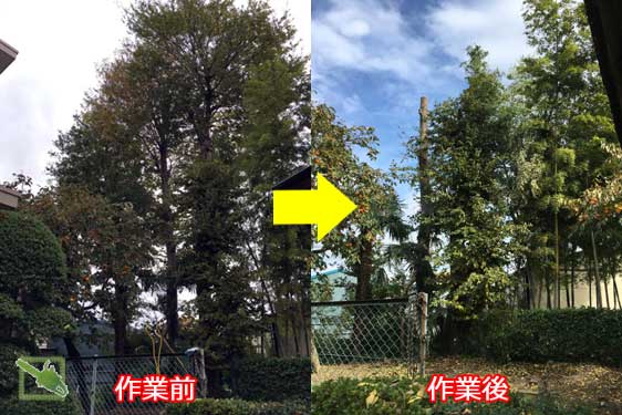 ご依頼有難う御座いました。 11/10(火)・11(水)の2日間、埼玉県戸田市にて、高樹3本(椋2本、欅1本)の伐採を完了しました。 予定では1日で作業を完了するはずでしたが、作業の途中で雨が本降りになってしまった為、やむを得ず、翌日に作業を持ち越しすることとなり、2日間の作業となりました。 まずは初日の様子から書かせて頂きます。 初日(11/10)は朝からどんよりとした雲が広がるあいにくの天気でした。 戸田市の天気予報は夕方まで曇りマークでしたので、作...