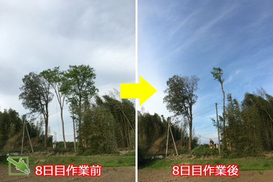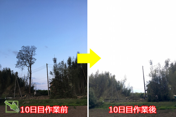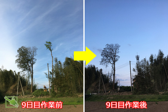 当ブログへようこそお越しくださいました。 最後まで読んで頂ければ幸いで御座います。 ご依頼有難う御座いました。 茨城県古河市の雑木林伐採、いよいよ10日目(4/29)です。 伐採する雑木は、樫の木9本、犬四手6本、檜4本、杉2本、モミの木1本、ハンノキ1本の大小合わせ、合計23本です。 本日までで、樫8本、杉2本、檜4本、モミ1本、ハンノキ1本、犬四手6本を伐採しました。 残すは、最後の一番大きな樫の木1本です。 残っている枝は、西側の電...