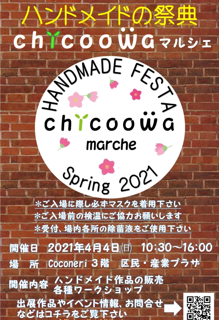 JUGEMテーマ:ハンドメイド雑貨のお店 JUGEMテーマ:練馬区 こんばんは! 表題の通りchicoowaマルシェを今年も開催します! 開催日時:4月4日㈰10:30〜16:00 開催場所:練馬駅併設Coconeri 3F 区民・産業プラザ 感染予防対策に万全を期して開催致しますので以下ご協力お願いします。 ・必ずマスクを着用してご来場下さい ・入り口での検温にご協力下さい ・入り口・場内での除菌液をご使用下さい ・体調の悪い方、熱が37.5℃以上の方はご来場をお控え下さい ・混雑時...