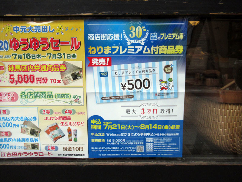 JUGEMテーマ:幸福に生きる JUGEMテーマ:和雑貨 JUGEMテーマ:インテリア小物・雑貨 JUGEMテーマ:地元のお店・ショップ・商店街 JUGEMテーマ:練馬区 【練馬区在住、在勤、在学の方へ】 コロナの景気対策の一環、『練馬プレミアム付商品券』の申し込みが、もうすぐ開始です。 今回のプレミアムは30%。 ひと綴り¥5000で¥6500分使える商品券です。 今までプレミアム付きで20%はありましたが、30%は太っ腹かなと思います。上限10万円まで買えます(つまり13万円分使えます...