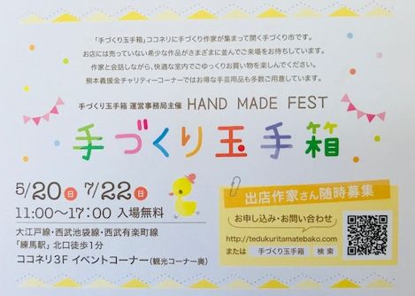 JUGEMテーマ:ハンドメイド雑貨のお店 JUGEMテーマ:練馬区 奇数月第3日曜日に開催される手づくり玉手箱。 chicoowaも去年2回ほど参加させていただいた事も有り、先ほどご挨拶に行ってきました(^^) 練馬駅前ココネリ3Fで開催されていますのでハンドメイド好きな方は是非お出掛けになってみて下さい! 私が伺った時はオープンしたばかりだったのでお客さんも疎らでしたが既にワークショップなどには人が集まって 楽しそうな雰囲気でした。 アクセサリー、インテリア、実用品、玩具など...