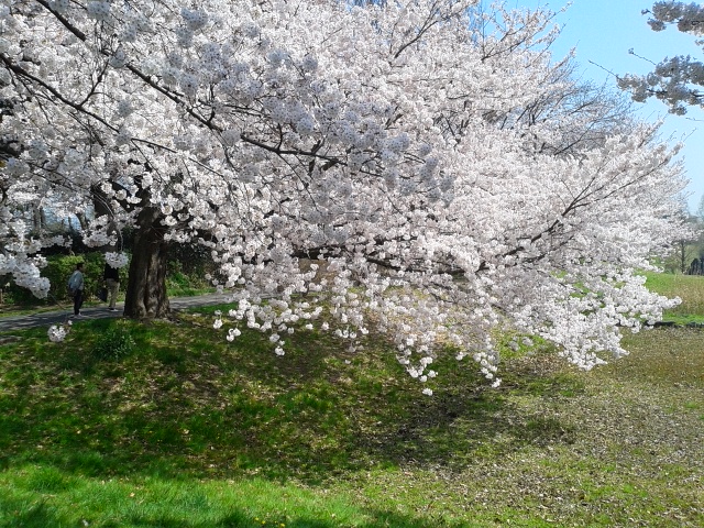 JUGEMテーマ:埼玉 満開の桜。大宮第二公園にて。 9時半に家を出て こみちさんとBCさんと、お花見しました。 午前の陽光を浴びて、今日満開です! 遊水池の斜面で サクラは広々と枝を伸ばしています 公園のなかにも、BCさんのお気に入りの場所があります。 見晴らしのよい場所に立つサクラの木。 遊水池、ソメイヨシノ、ヤナギ、しだれ桜、菜の花が見えました。 この位置から、6枚連続でパノラマのつもり↓ 春休みの家族連れ、ランニ...