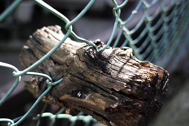 JUGEMテーマ:東京散歩 柵に食いこんで、後先を切られたあげく取り残された木片。 取り除く作業が大変なので朽ちるのを待つのであろうか。