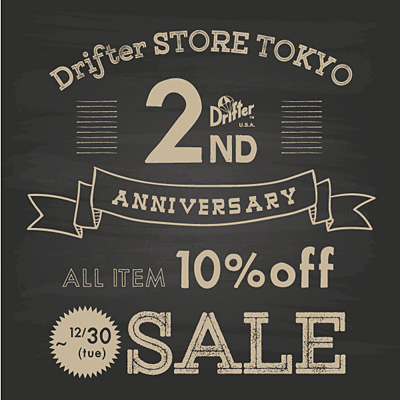 こんにちは!最近はとても寒い日が続いていますね!寒さに負けそうな時もありますが、只今STORE TOKYOでは大変アツいイベントを開催中です!Drifter STORE TOKYOは、12月20日にオープンから2周年を迎えます!いつも支えて下さってる皆さまへの感謝の気持ちを込めまして、12月30日まで店内全品10%OFFのセールを開催しております!また、5,000円以上お買い上げ方にはノベルティもプレゼント!さらにご来店頂きますと、よりお得な事があるかもしれません!店内全品対象ですので、発売したばかりのDENIMやCORDUROYの商品も10%OFF!!限定商...
