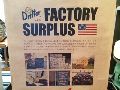 こんにちは!寒い日が続いておりますが、皆さま体調など崩されていませんか?本日は店舗にて開催している「FACTORY SURPLUS」をご紹介します!FACTORY SURPLUSとは、旧作の商品やアメリカの工場にてデットストックとして眠っていた商品を大変お求めやすいお値段にて提供するDrifter直営店限定のイベントです!ほぼ全てが、廃版となった商品や元々入荷していなかった商品ですので、とってもレアなアイテムばかり!!その中でもオススメはこちら!春夏に向けてはもちろん、暗い色のアウターを着る機会が多い今シーズンもこのビビットなピ...