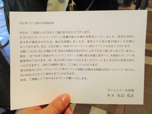 サンシャイン水族館に来ました。 折しも、「11月8日に大型水槽内の魚類が大量死」という報道があったのだが…。 この日は、入口で状況を説明した紙を配布していた。 大量死の起きた「サンシャインラグーン水槽」の安全性が確認されたので再開したが、 以前のような魚の数にはいたっていない旨の説明だった。 でも、ウクレレさんは初訪問だったので、違いが全然わかりませんでした。 普通に美しくて素晴らしい展示と感じました。 常連の方はいろんな気持ちが...