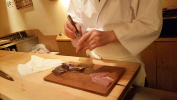 とある日のスタッフ達の昼御飯後の藤山。 この日は昼休憩も早々に、板前の安部さんが 何やら細かい作業を始めました。 魚は『いさき』 どうやら夜のメニューで煮魚として出す仕込みを行っているみたいです。 煮魚は特に口の中で骨が残りやすいもの。 食べている時に骨があると、誰しも決して良い気分にはならないはず。 そこで、そのいさきの骨を一本一本取るという、 何とも根気のいる作業を行っていたという訳です。 骨を丁寧に取る...