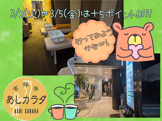 皆さん。 いつもお世話になっております。 本日は3/3ひな祭りですね。 3月に入ってもまだまだ寒さが続いています♪ 体調には気をつけてくださいね♪ 先日からご案内しておりますあしカラダアプリ。 本日もお得な+5ポイントDAY開催中です。 3/2(火)〜3/5(金)はアプリ会員様限定+5ポイントです。 この機会にぜひご登録を\(^o^)/ お得情報満載の『あしカラダアプリ』をおすすめしています。 ご登録が未だの皆様(>_<) この機会にアプリ会員に移行をお勧めい...