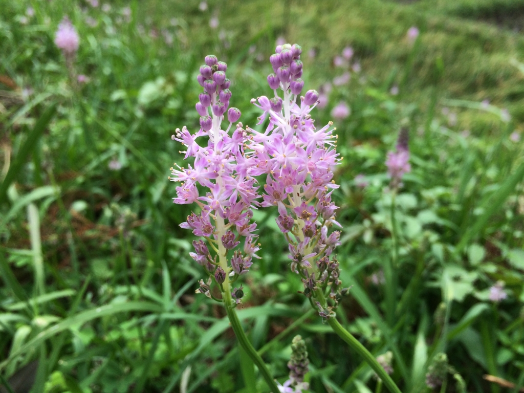 今日の昭和の森は曇っています。風は弱く過ごしやすい気候です。台風の影響で前線が動いています。一時的に小雨が降るかもしれません。 田の畔に紫色の花が咲いています。小花の房です。ツルボでしょうか。葉は細長く球根は有毒だそうです。