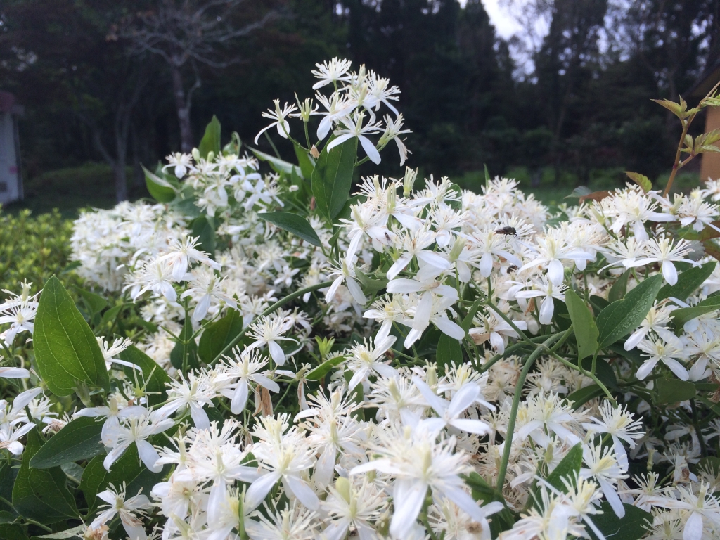 今日の昭和の森は曇っていますが、時々陽が射します。朝方までは時々雨が降っており、蒸し暑くなってきました。台風の影響でしょうが、すぐには秋になりません。 白い華麗な花が密集して咲いています。ツタ性で葉は卵型です。センニンソウでしょうか。そうだとすると有毒種なので気軽に触らない方がよいでしょう。反面、薬にも利用されるそうです。