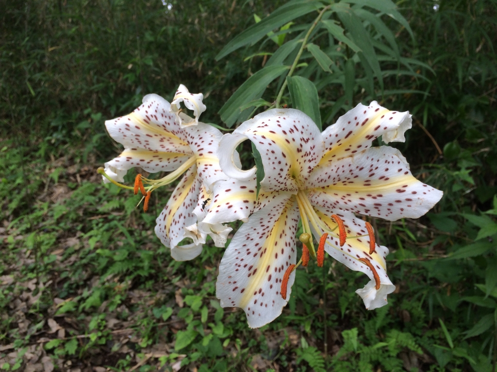 今日の昭和の森は曇っています。穏やかで蒸し暑いです。 真夏の花が咲いています。大きくて目立つヤマユリです。香りも強く見えなくても気配を感じます。花が大き過ぎて重いのでしょう。頭を垂れる姿が多いです。中には支柱が添えられ、背筋が伸びている個体もあります。