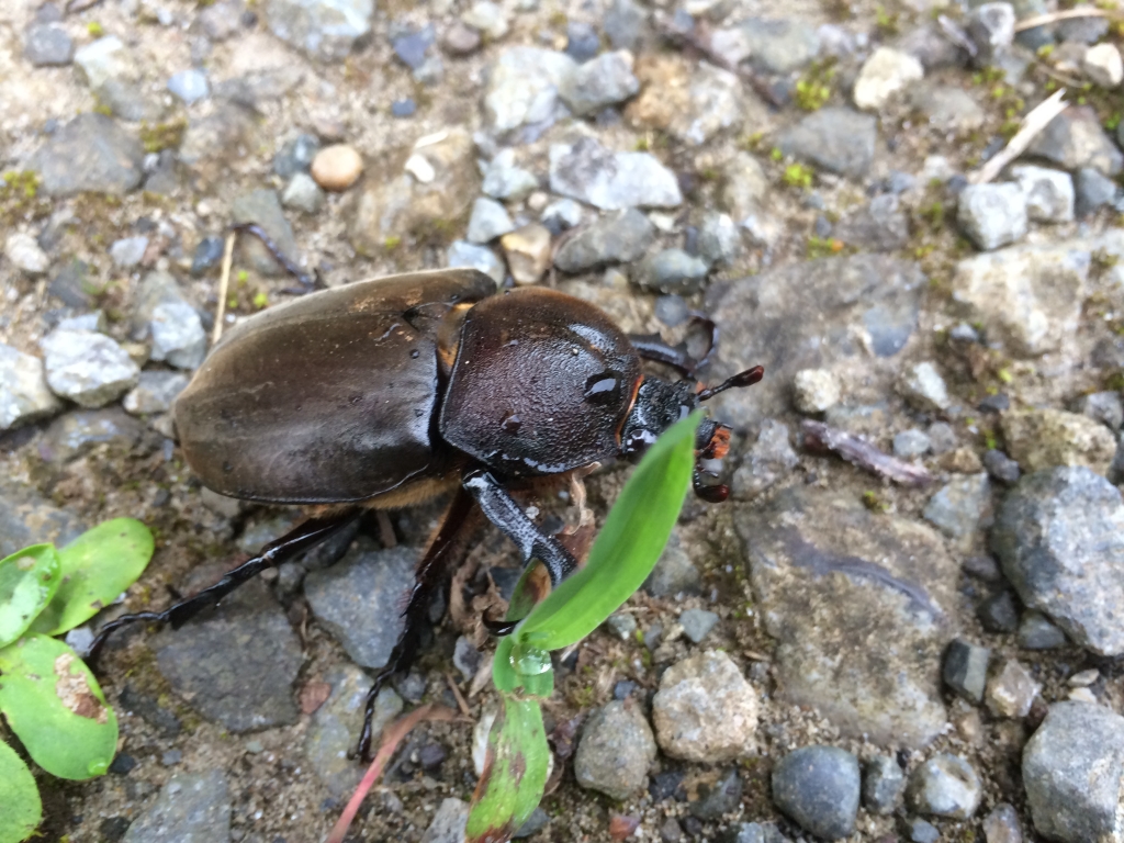今日の昭和の森は曇り時々晴れです。穏やかでとても蒸し暑いです。 カブトムシのメスです。汗をかきかき歩道を渡っています。いや、汗はかかないですね、朝露が付着したのでしょう。日中は木の根元などにもぐりこんでいるのでしょうが、昭和の森でカブトムシを見かけるのが少なくなったような気がします。皆さんはいかがですか。