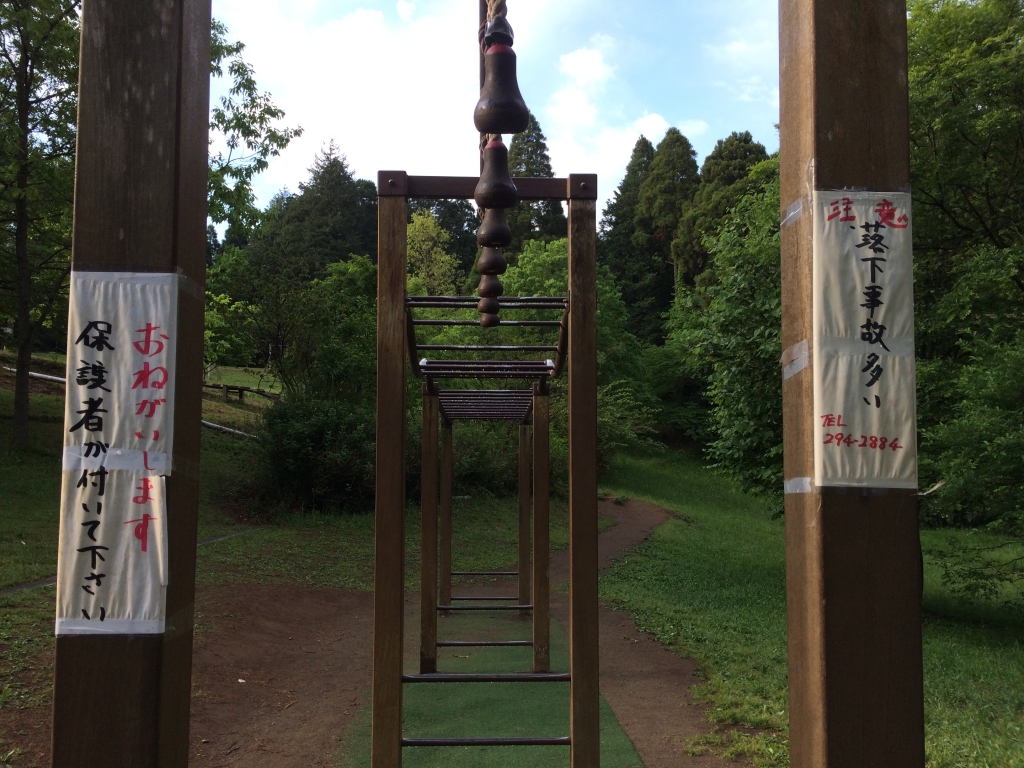 今日の昭和の森は、曇り時々晴れです。パッとしないボヤっとした天気です。空気はヒンヤリしていますが、陽が射すと暑くなります。 アスレチックコースの雲梯にこんな張り紙がしてあります。連休中にお子さんが落下して怪我でもしたのでしょうか。確かに高さがあり、落下するとかなりの衝撃でしょう。このほかにも注意の立て札があります。保護者の方は、くれぐれもご注意ください。