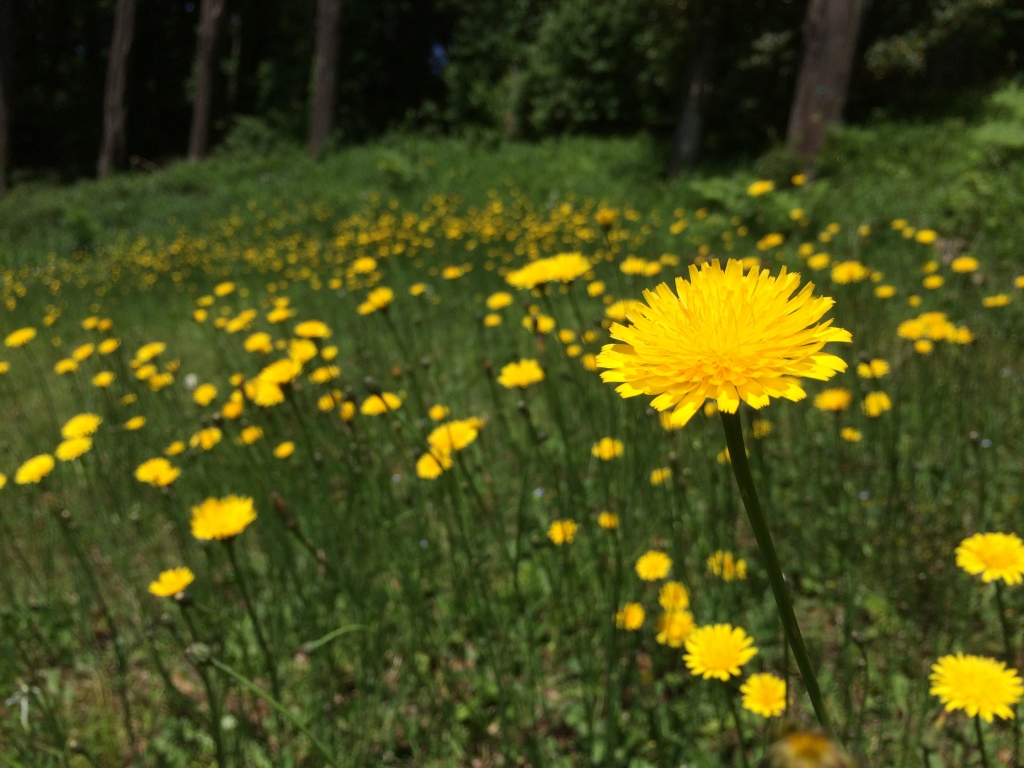 今日の昭和の森は晴れ時々曇り。風が吹いています。爽やかな気候です。予報に反していい気候になりました。 園内の草原は黄色一色になってきました。タンポポの盛りです。花期は短く、あっという間に綿毛のついた種子になります。ところで、野の花は黄色か白が多いですね。