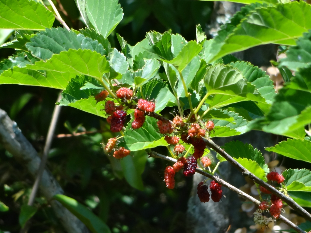 今日も昭和の森は快晴です。朝から気温が高いです。湿度が高くないのが救いです。こんな日は、日陰になった森の散策にとどめましょう。水分補給はしっかり。 桑の実が色づいてきました。見るからにおいしそうです。葉っぱは蚕の大好物。木は固く工芸品や楽器に使用されるそうです。古くから人との関わりが強い桑の木です。
