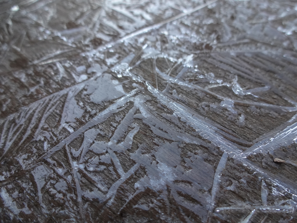 今日の昭和の森は晴れています。二日間、冷たい雨が降ったので爽やかに感じます。風は少し、お昼頃には暖かくなるでしょう。 放射冷却でしょうか、今朝は冷え込みました。よく見ると氷が張っているではないですか。局所的に気温が下がって零下になったのでしょう。
