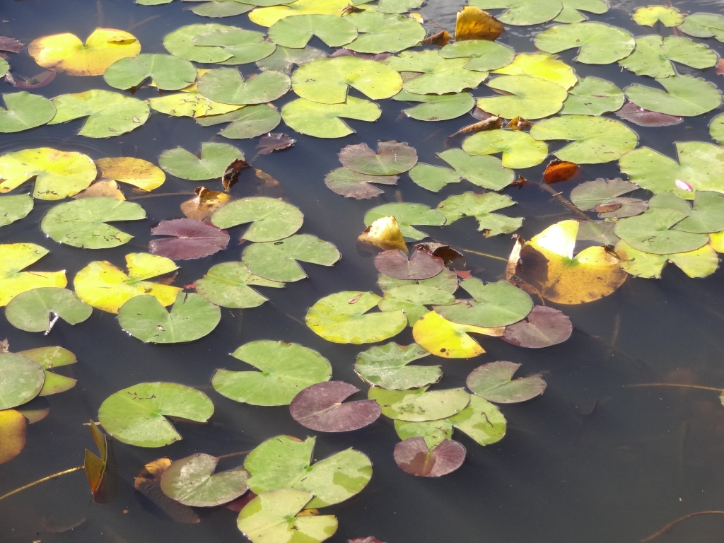 今日の昭和の森は晴れたり曇ったり。少し風が吹いています、寒くはありません。 下タ田池のスイレンは夏の間、赤や白の花を楽しませてくれました。今の時期は葉の緑が褪せ、紅葉し始めています。黄色い葉の水面を見るのもいいです。
