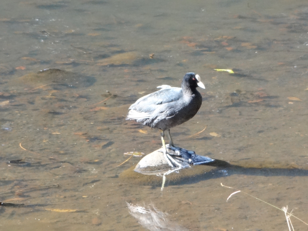 今日の昭和の森は晴れています。午前中は快晴で午後に雲が増える日が続いています。朝は寒かったのですが、お昼くらいには暖かくなりました。 下田タ池では水鳥の数が増えてきました。カモなどが越冬目的で飛来します。オオバンもその仲間。鼻が白いのが特徴です。珍しく石の上に立っていました。